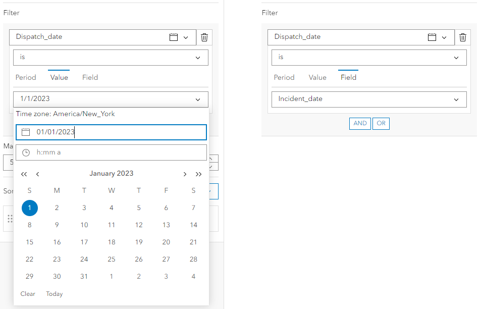 The Time zone information only displays on the calendar when the dashboard time zone is different from the device time zone. The Field tab only appears if the element's layer includes more than one date field.