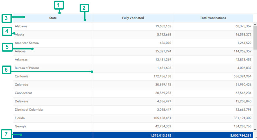 A table presents data attributes in rows and columns and allows you to quickly scan precise values, look up a metric for a category, summarize a collection of metrics, and more. A tabular view of the data can be a quick way to analyze information and start making decisions. The table element can display feature attributes or summary statistics for categories repeating in a field. As with other data-driven elements, you can create filters and configure actions for a table.
