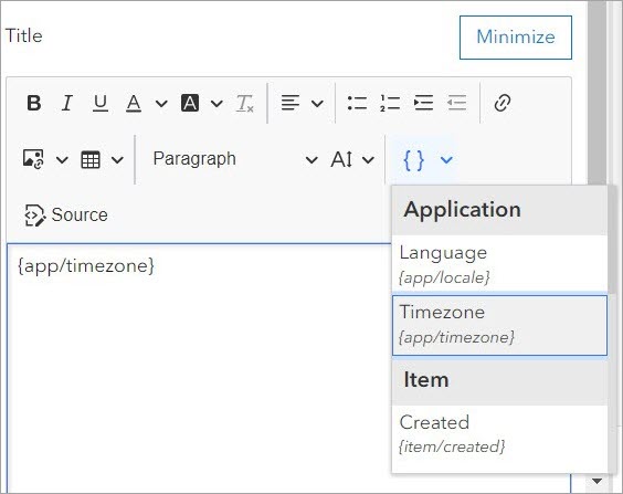 The dashboard time zone can be inserted into the display in most places you see the Insert button time zone variable, including splash screens, headers, element titles, and descriptions.