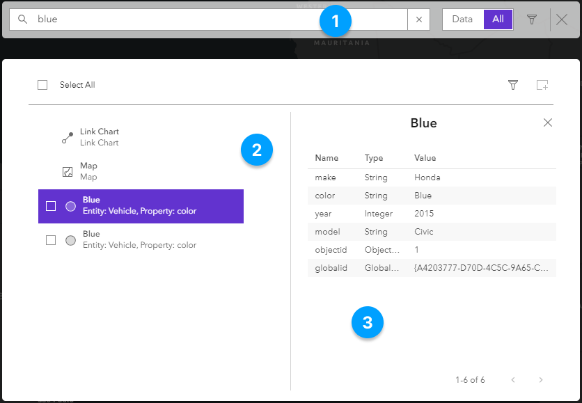 1. Search bar—Modify the scope of the search term. By default, the entire project is searched as well as the entities in the knowledge graph.
