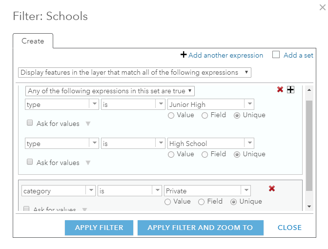- If you have multiple expressions, how and if you group the expressions in sets affects the filter expression definition and what you see in the map. In the following example, any private school that is a junior high or high school will draw on the map.