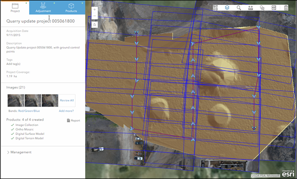 - Quick adjustment and create products—Performs a nonrigorous adjustment on the images at a coarse resolution. The products created include the orthoimage mosaic, DTM, and DSM. This workflow is useful for generating an estimate of the block adjustment and products to verify the potential quality before spending the time and processing capacity of generating optimum block adjustment results and high-quality products.