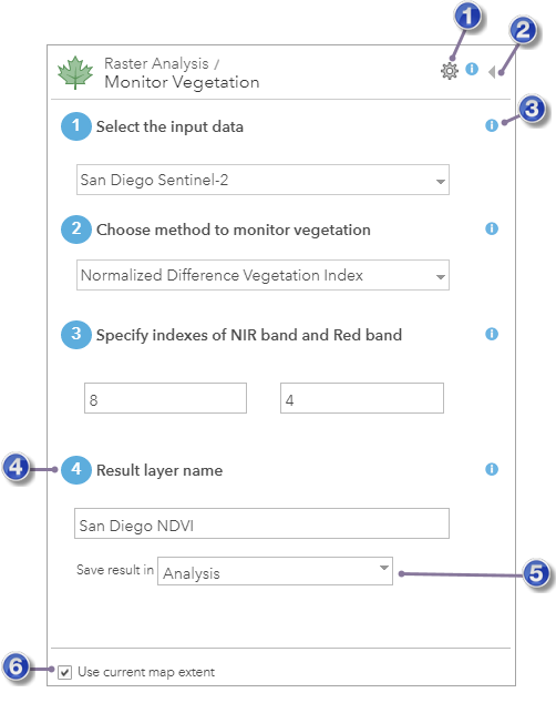 To open a raster analysis tool pane, click the tool button. This opens the tool's pane as illustrated below with the Monitor Vegetation tool.