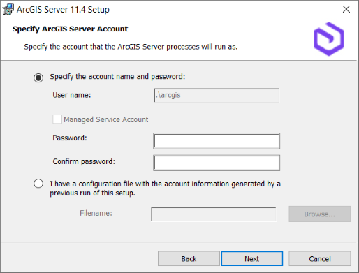 - If you select the second option, I have a configuration file with the account information generated by a previous run of this setup, the credentials in the server configuration file must be the same credentials used by your existing ArcGIS Server site.